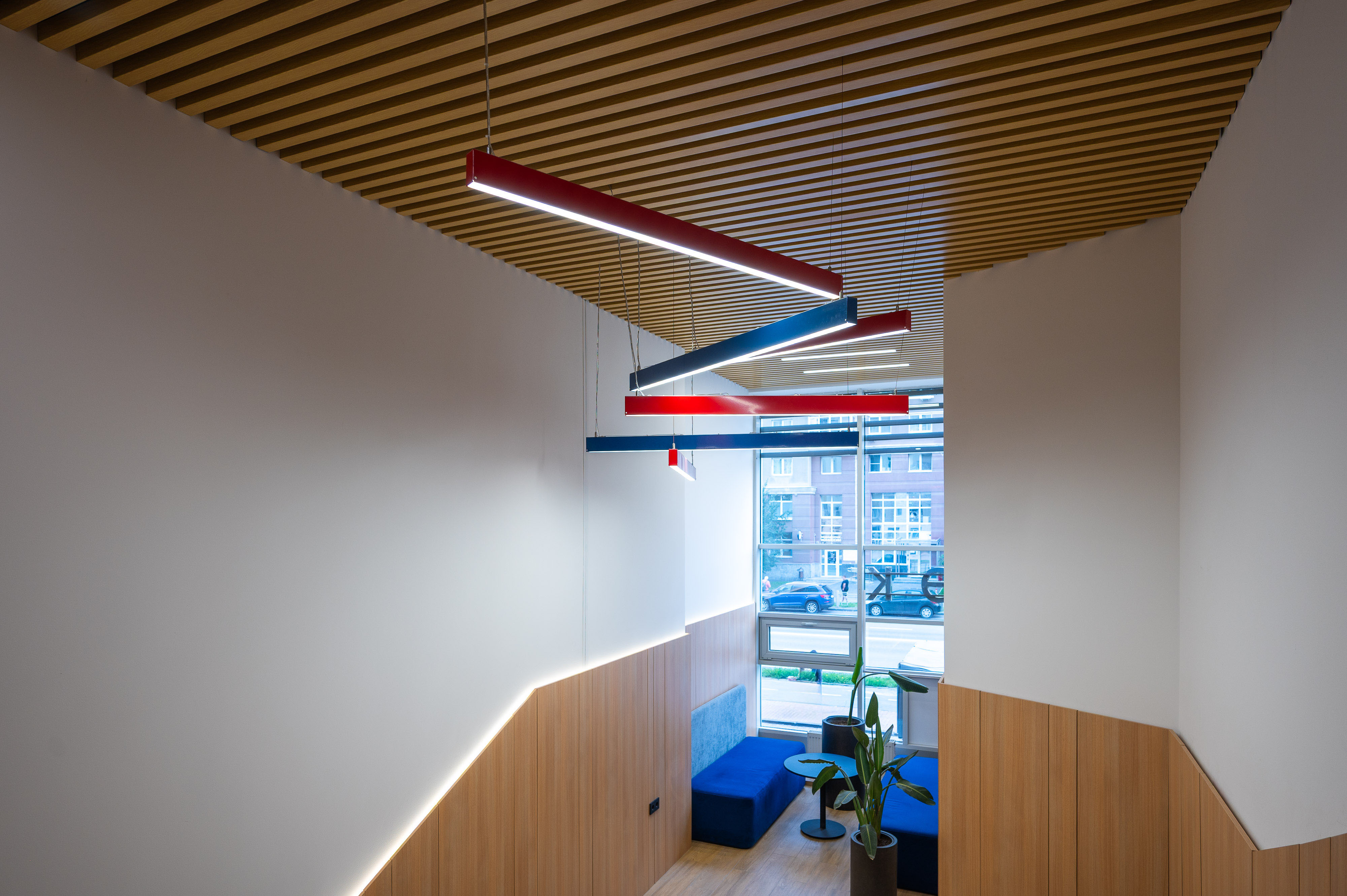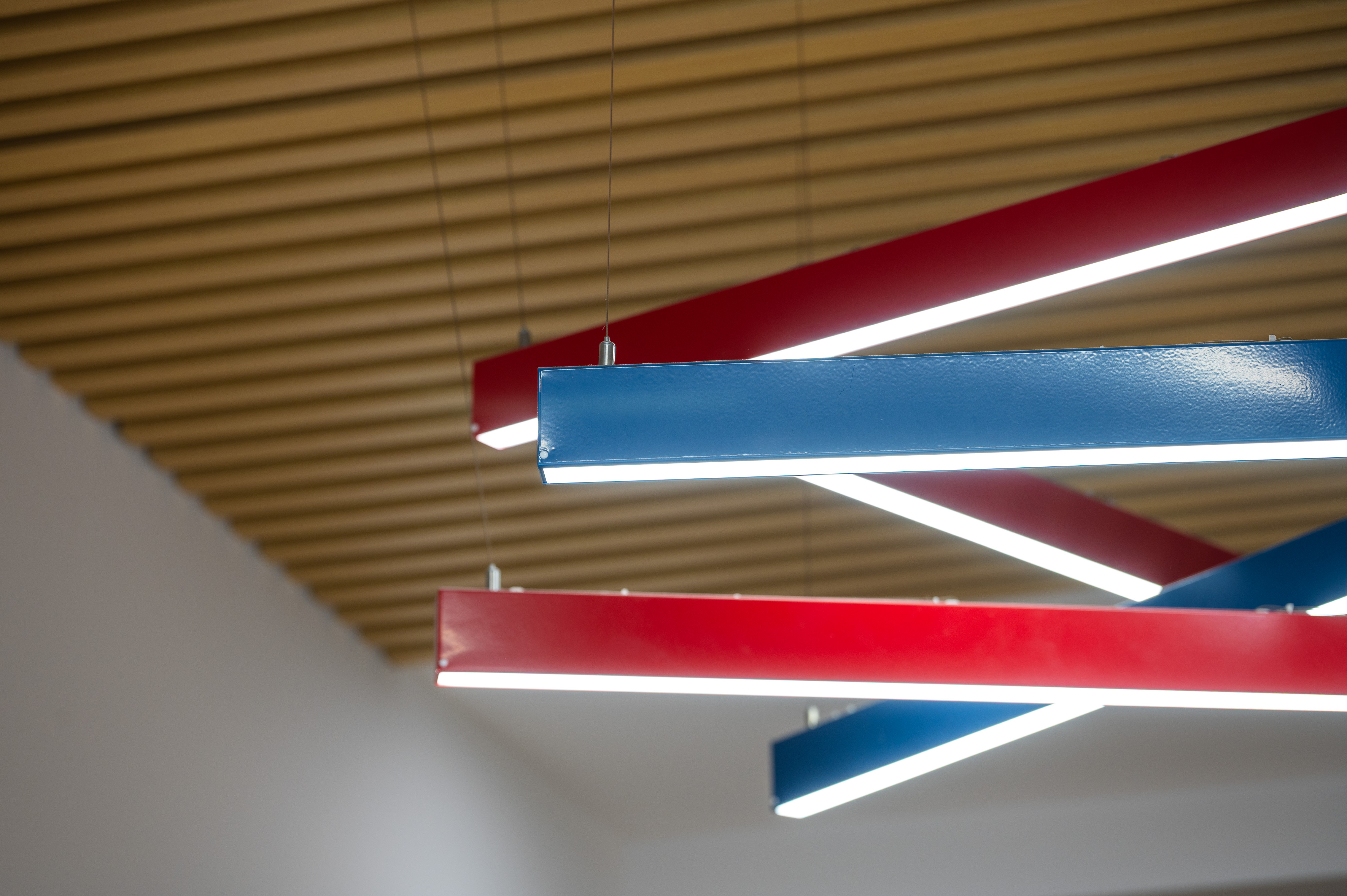 Акцентная композиция из подвесных светильников Line красного и синего цвета 1472×40×80, 30Вт, 4000K, Опал.