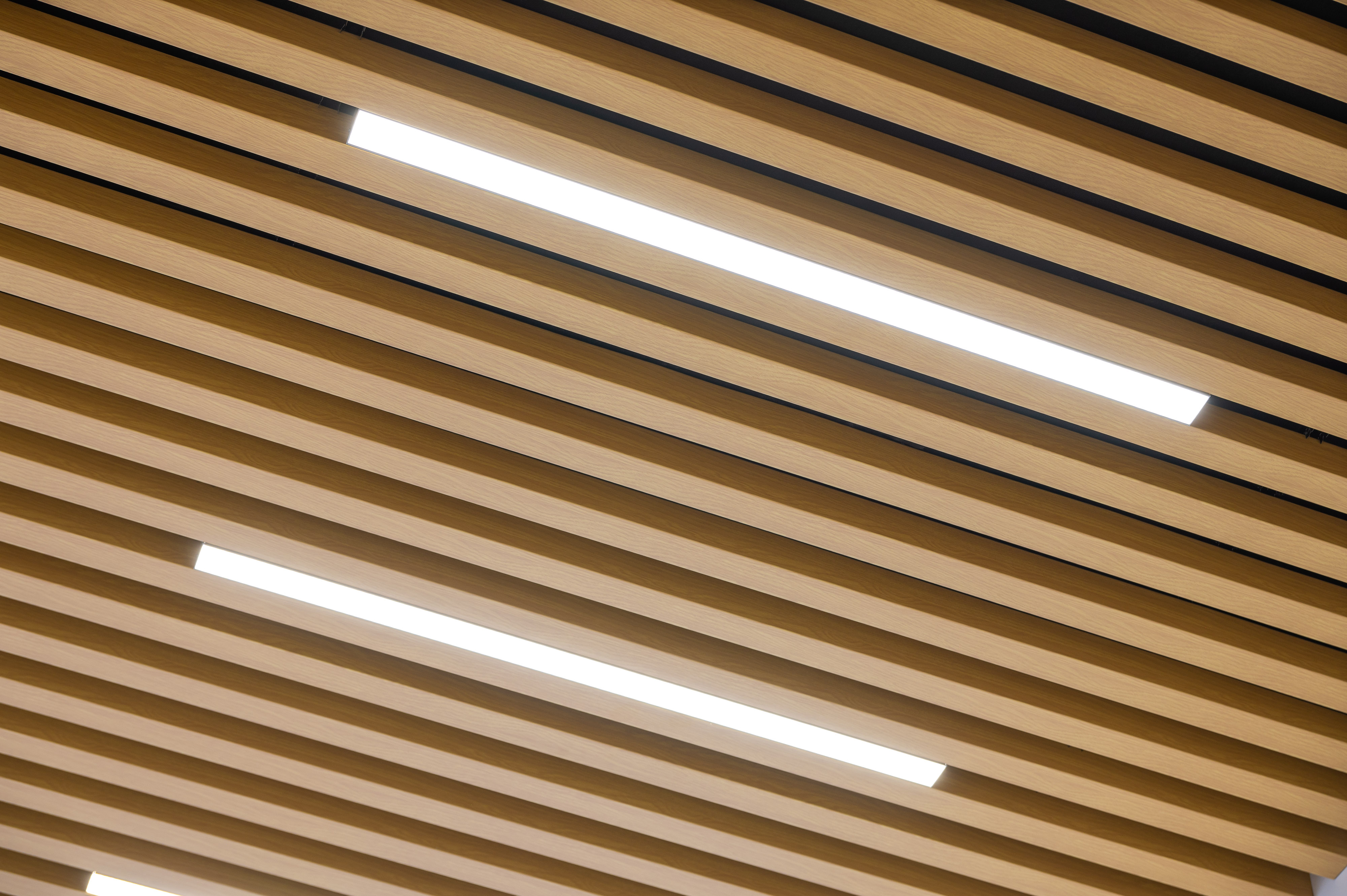В реечный потолок встроены светодиодные светильники Line Standart 2450×40×50, 50Вт, 4000K, Опал, а также Сейлинги 20Вт.